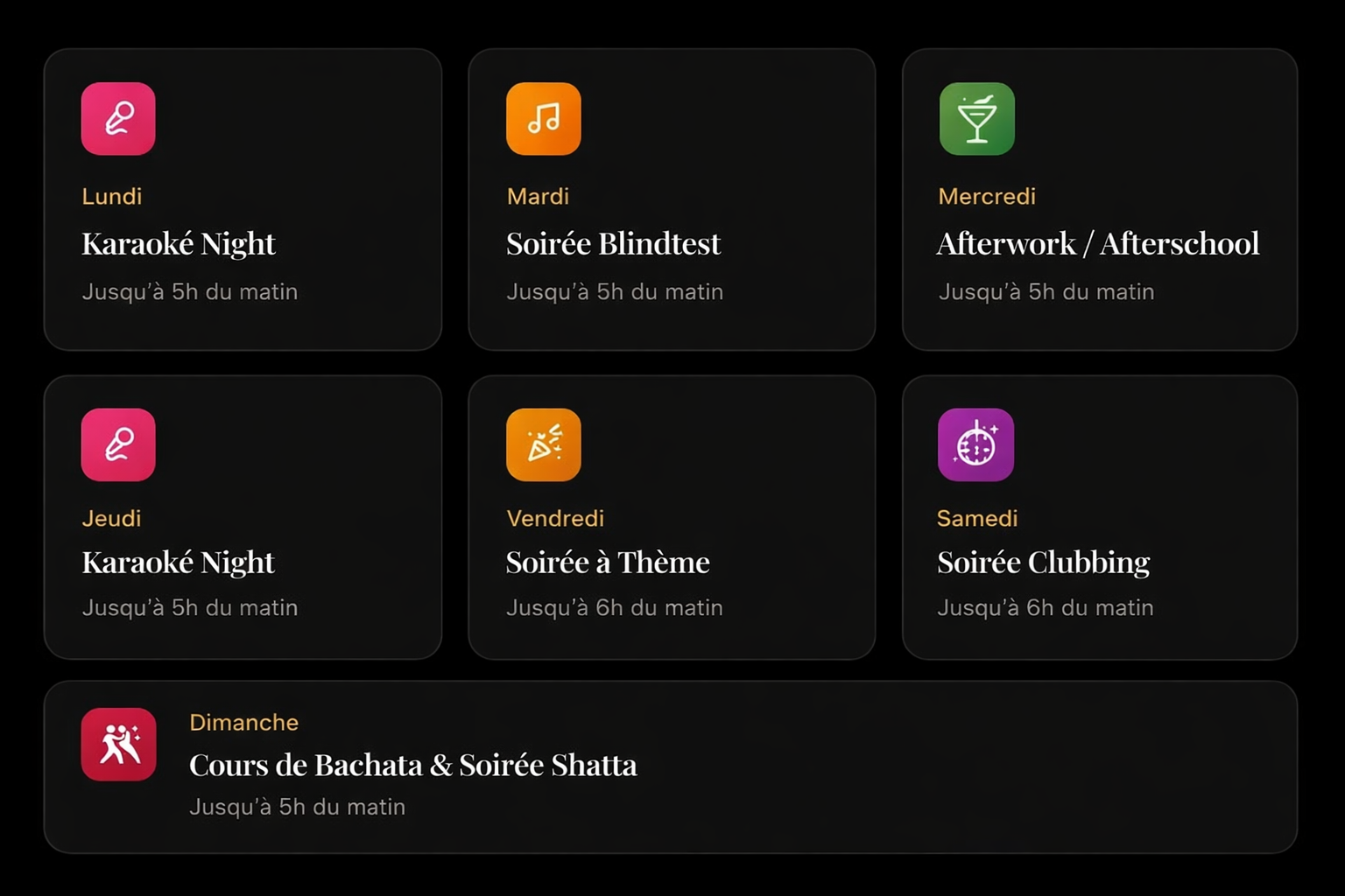 Blindtests, concerts, matchs, soirées à thème, karaokés, quiz, tournois de beer pong, ping-pong, magiciens…