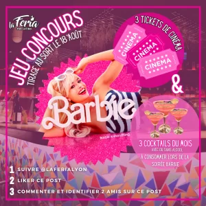 Le gagnant remportera 3 cocktails du mois (cosmo rose) avec ou sans alcool, et 3 billets pour une séance cinéma pour le film Barbie à Lyon.